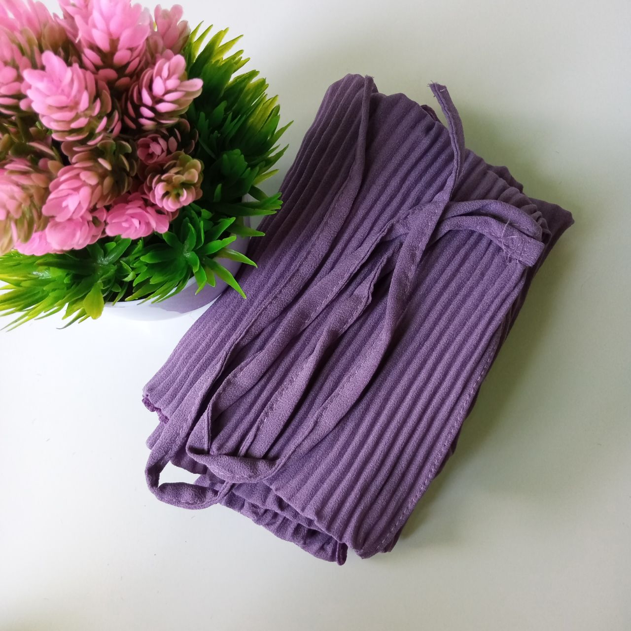 Perincian: – Kategori Jilbab instant wanita – Bahan diamond – Warna Ungu lavender – size 65cm x 75cm – Pattern plisket – Style bergo maryam